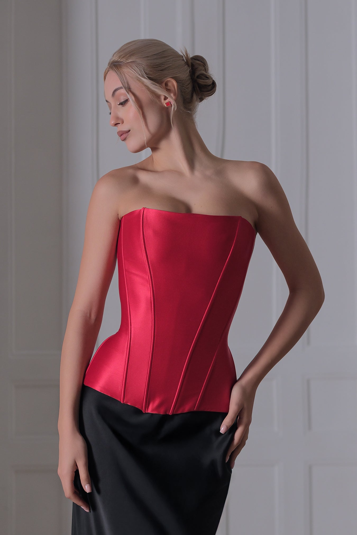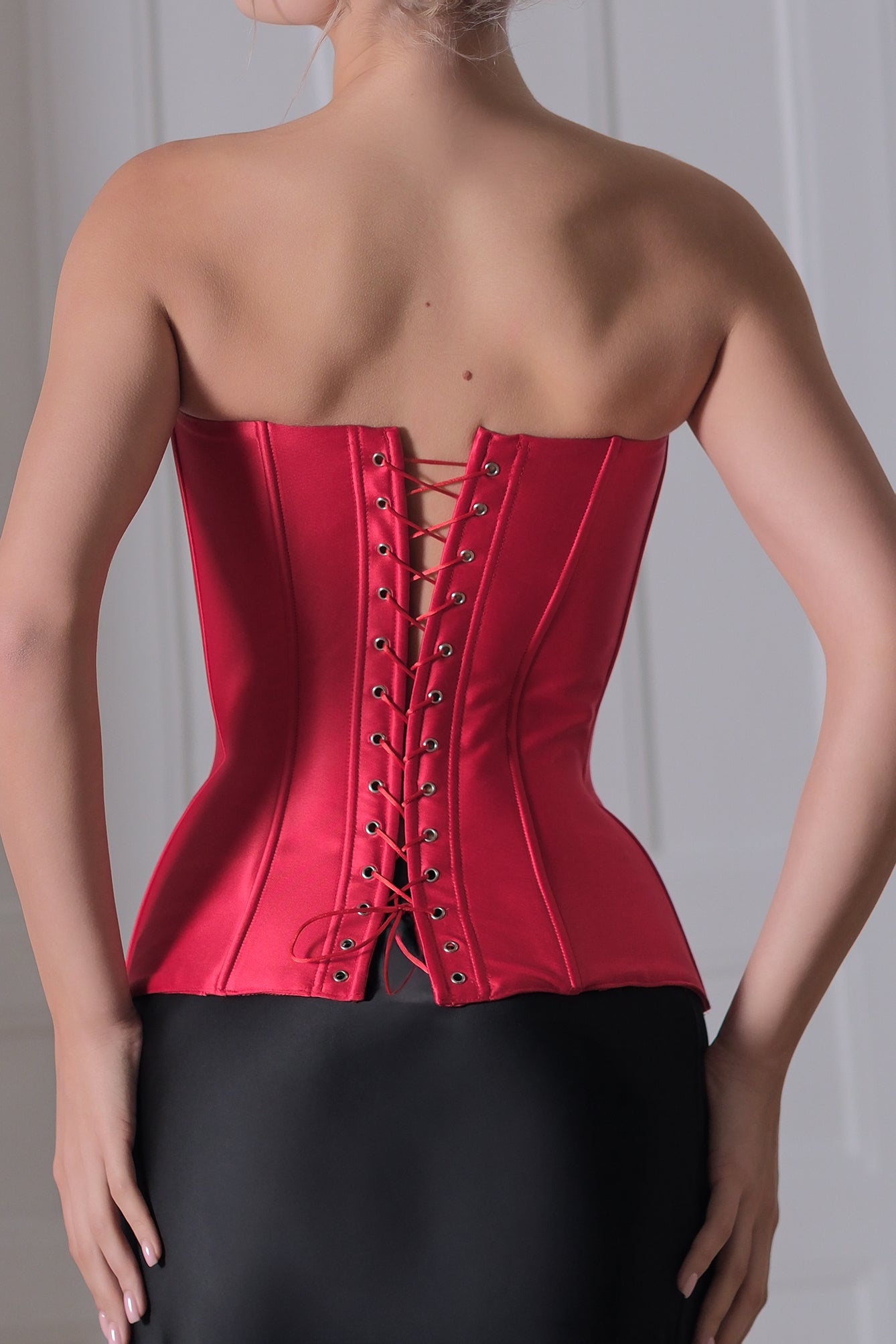 Изработен от висококачествени материали - плътен сатен. Придържа добре бюста и се завързва с връзки, които се намират отзад на гърба. Корсетът е създаден с прецизни вертикални банели, които не само подчертават талията, но и осигуряват изключителен комфорт и опора. Дизайнът с изчистено деколте придава модерна и минималистична визия, идеална за стилни и уверени жени.