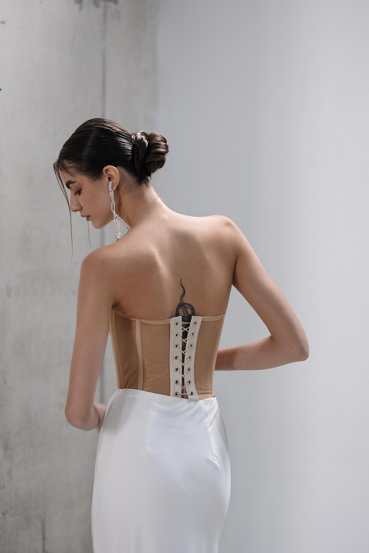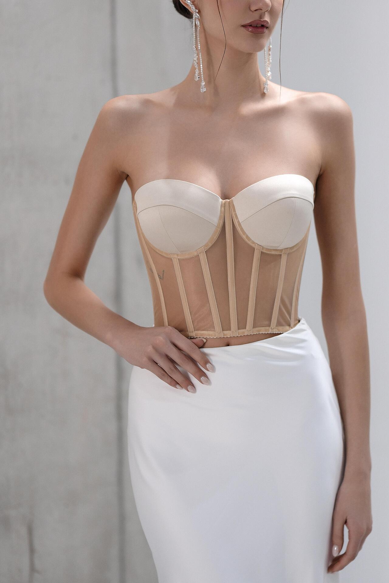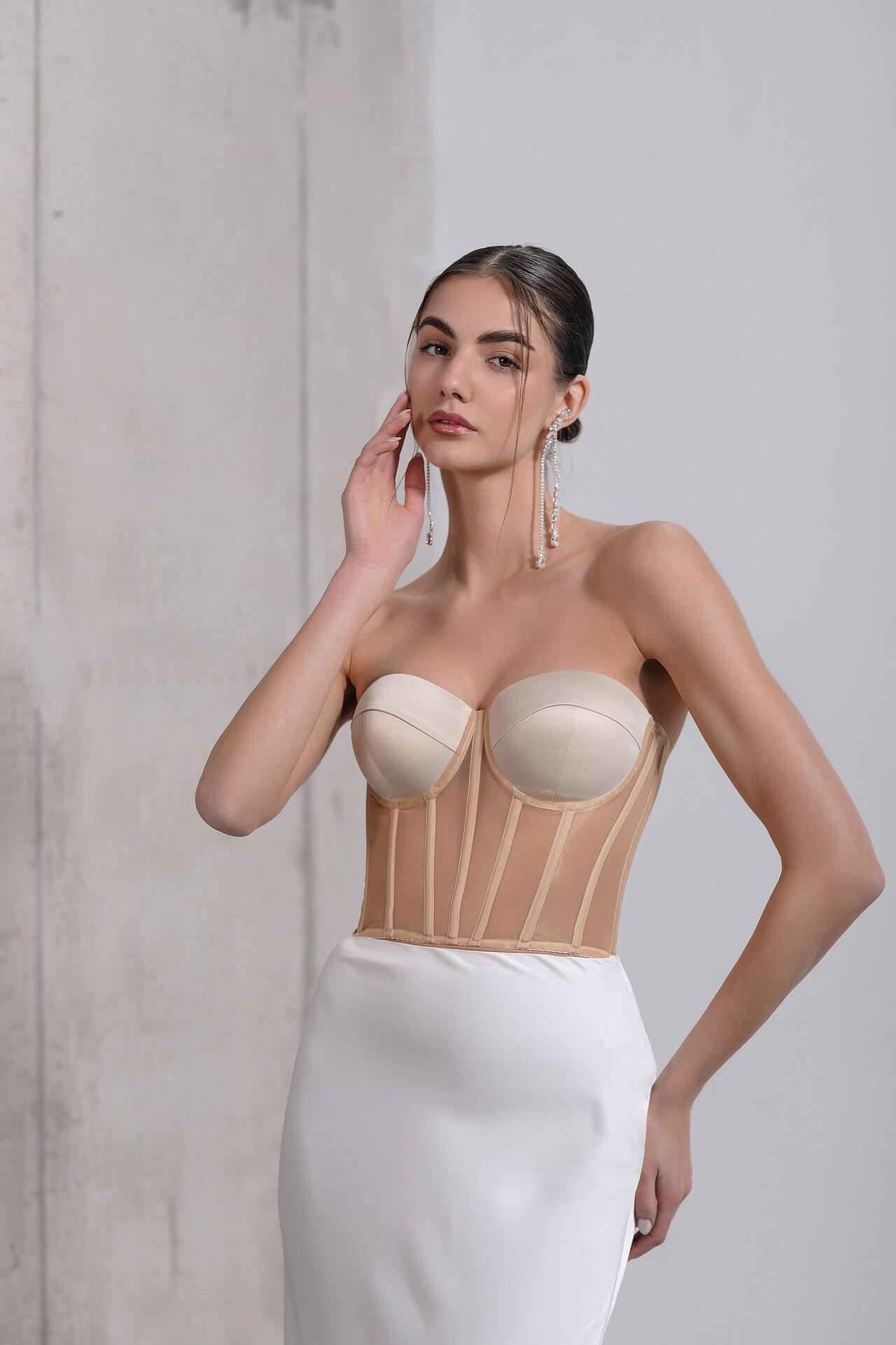 A corset in a delicate flesh color, transparent under the bust. The mesh allows the skin to breathe, making it ideal for warm days. It fits perfectly and defines the waist. It fastens with ties at the back. Suitable and practical for many occasions, easily combined with both formal and sporty elegant looks.
